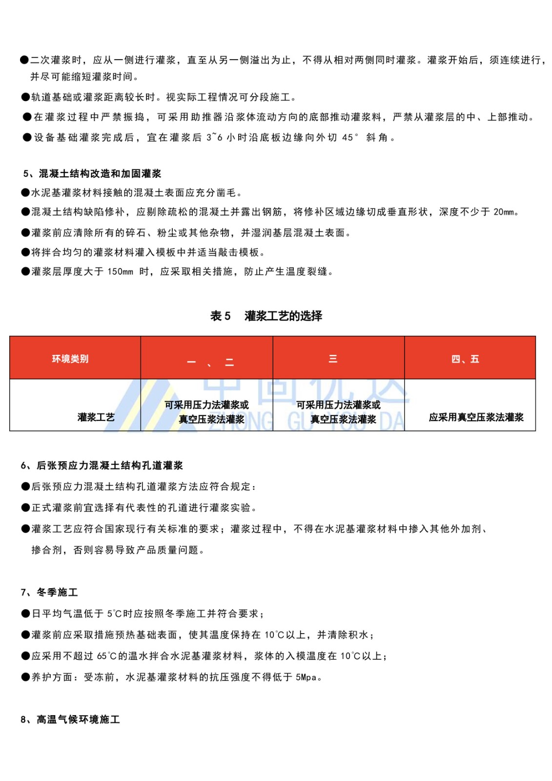 5、灌漿后至脫模前,應(yīng)避免碰撞到灌漿部位和設(shè)施,以免損壞未結(jié)硬的灌漿層;