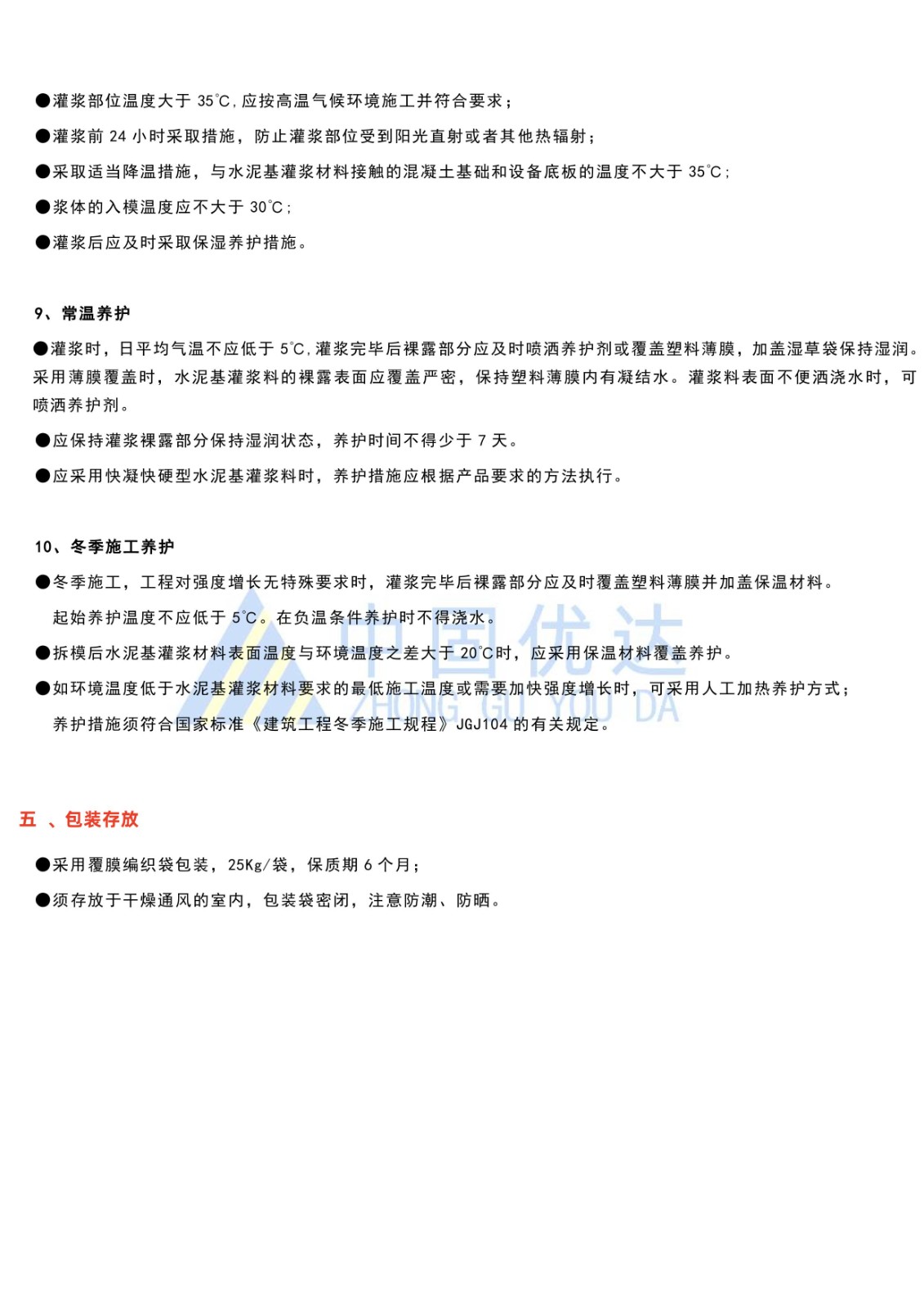 7、高強(qiáng)無收縮灌漿料不能與普通水泥混用,不能摻入外加劑。