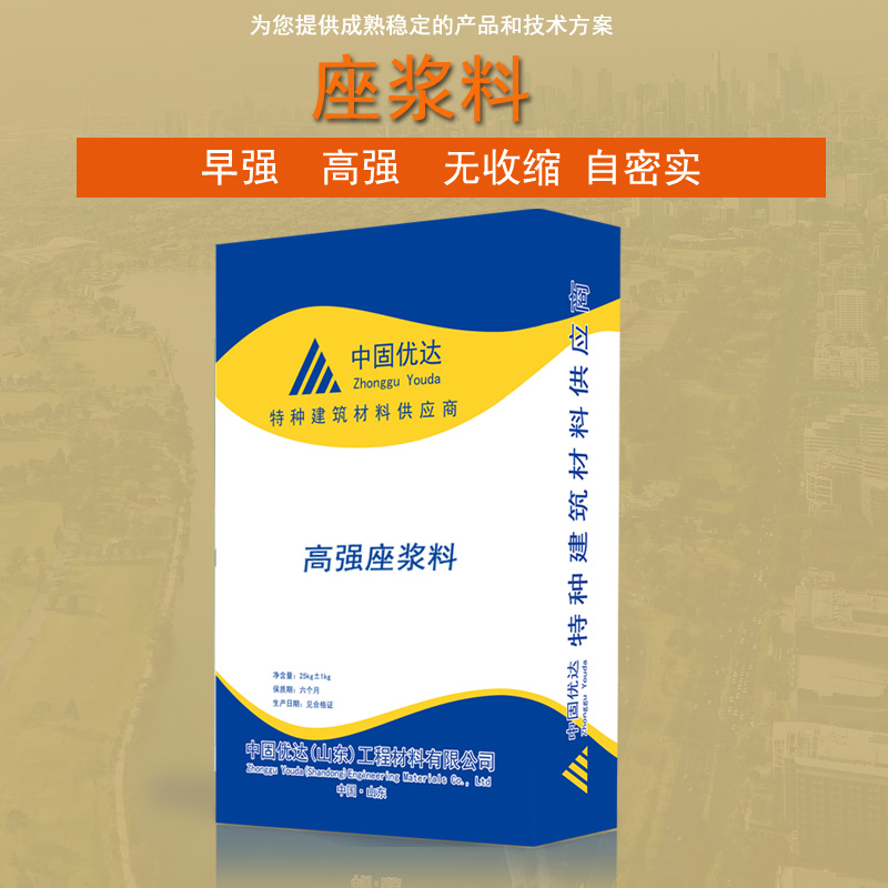 座漿料是灌漿料的一種,由水泥作為結(jié)合劑、高強度細骨料、復(fù)合膨脹劑、減水劑等摻合料及其他外加復(fù)合材料組成的水泥基干混料,具有早強、高強度、微膨脹、無收縮、不流掛、易施工等性能,加水攪拌后具有觸變性、可塑性,硬化性保水性好,座漿料的使用可以避免其他灌漿料流動性過大,施工不易,顆粒太粗, 粘性差,泌水嚴重,開裂爆倉等現(xiàn)象。